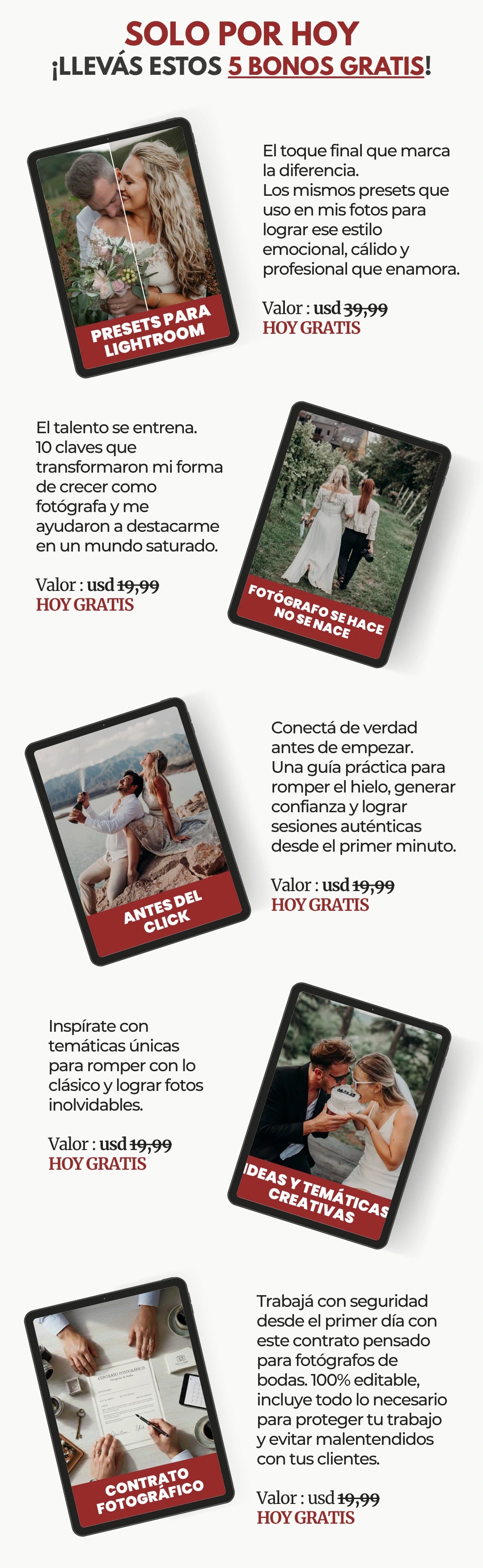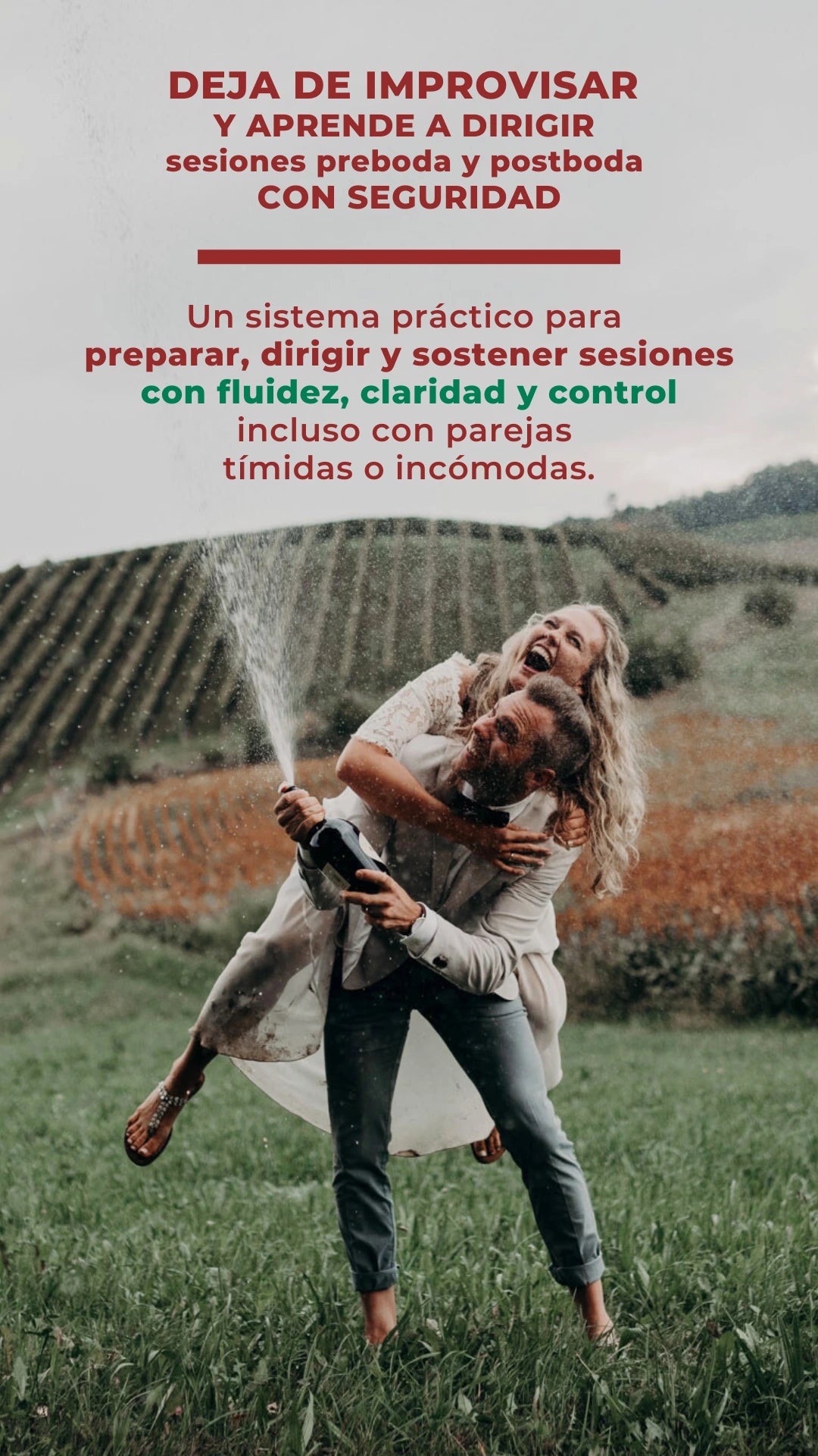 Un sistema claro para saber qué decir, qué hacer y cómo guiar sesiones preboda y postboda, sin poses forzadas, sin silencios incómodos y sin quedarte en blanco.